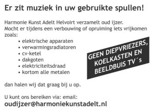 Al velen jaren halen enkele vrijwilligers van Harmonie Kunst Adelt in Helvoirt en omgeving oud ijzer op om wat extra geld binnen te halen voor de club kas. Mocht u nog oud ijzer of andere metalen hebben waar u van af wilt, laat het ons weten! Wij komen het graag bij u ophalen.